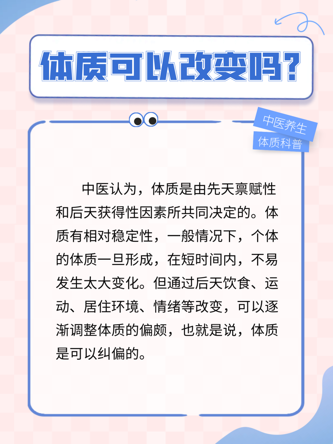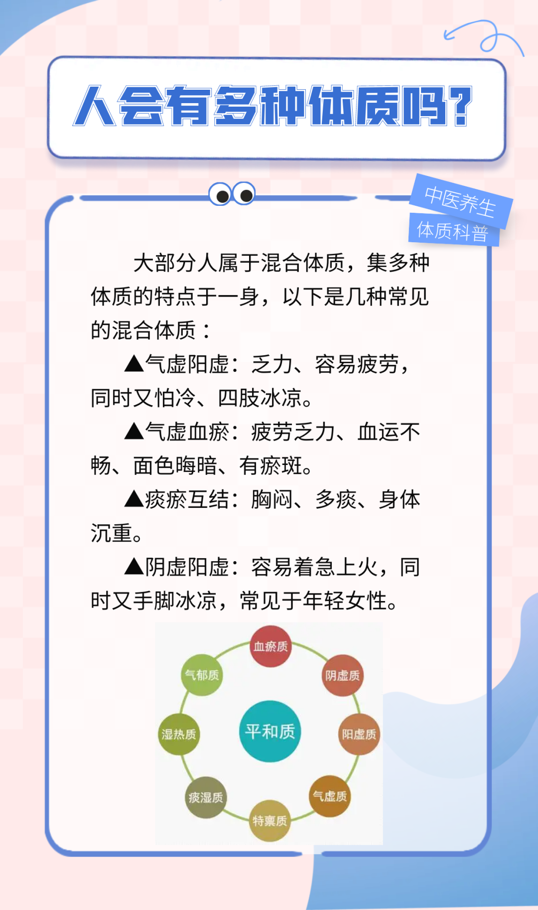生活中,有人急脾气,有人慢性子;有人不耐寒,有人不耐热……这可不是偶然现象,可能是你的体质在起作用。 今天就由我院中医专家任丽雯主任,来和大家聊聊中医理论中关于体质的那些事,给不同体质的人划个调养重点,搞对自己的体质,才能掌握养生的重点。