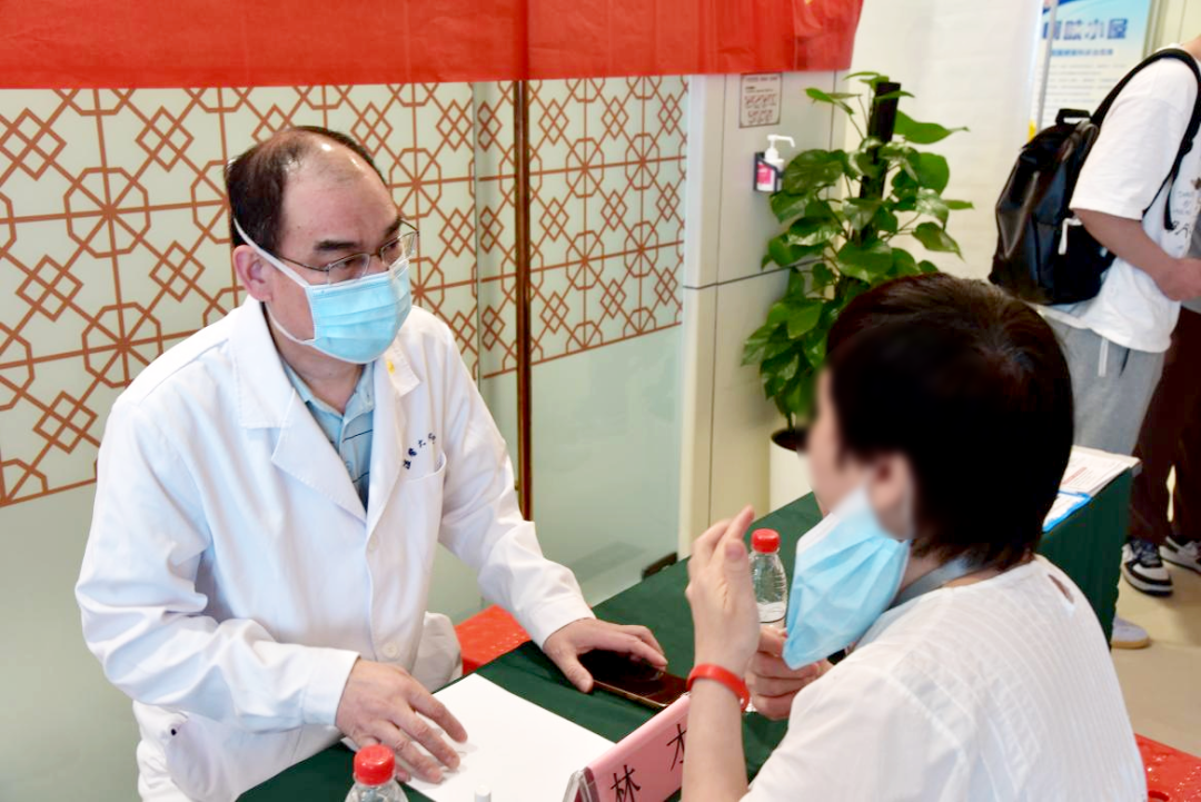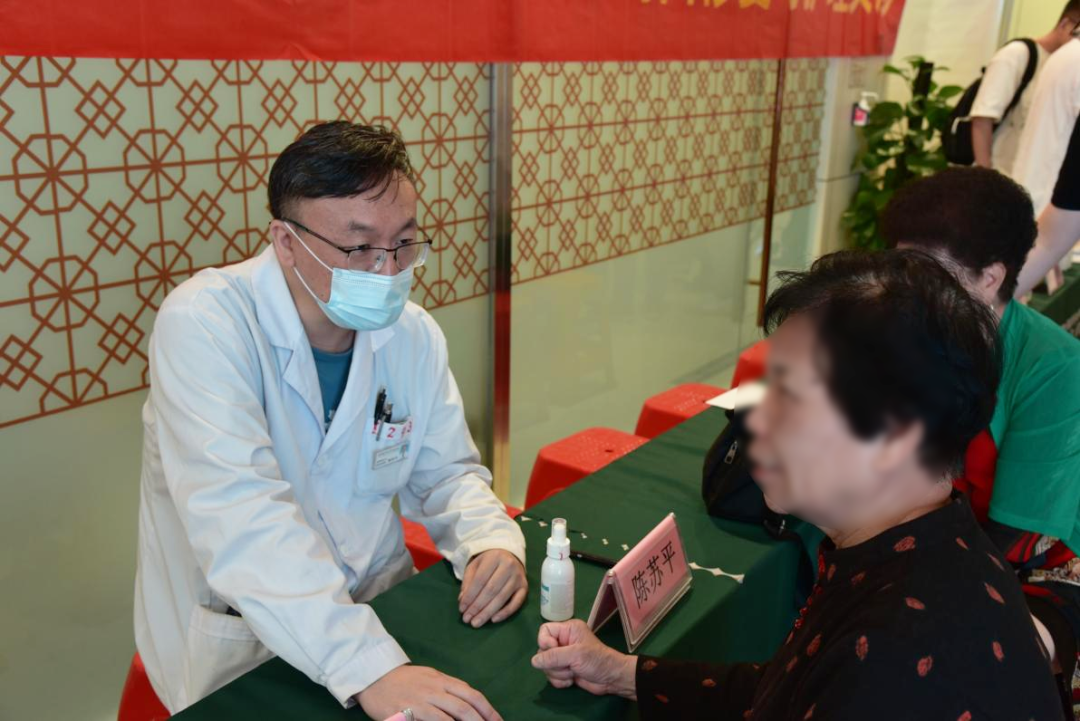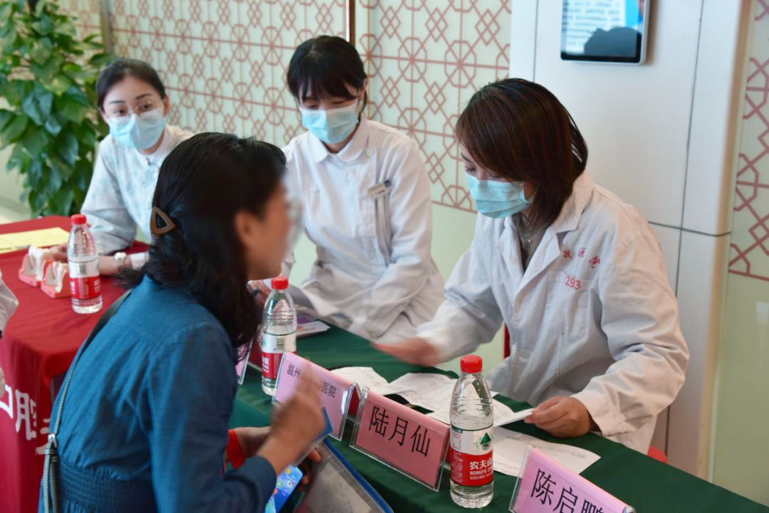 ▲温医大附一院林才主任、黄景勇主任,在义诊活动现场为现场群众耐心解答创面、血管类疾病相关的健康问题。