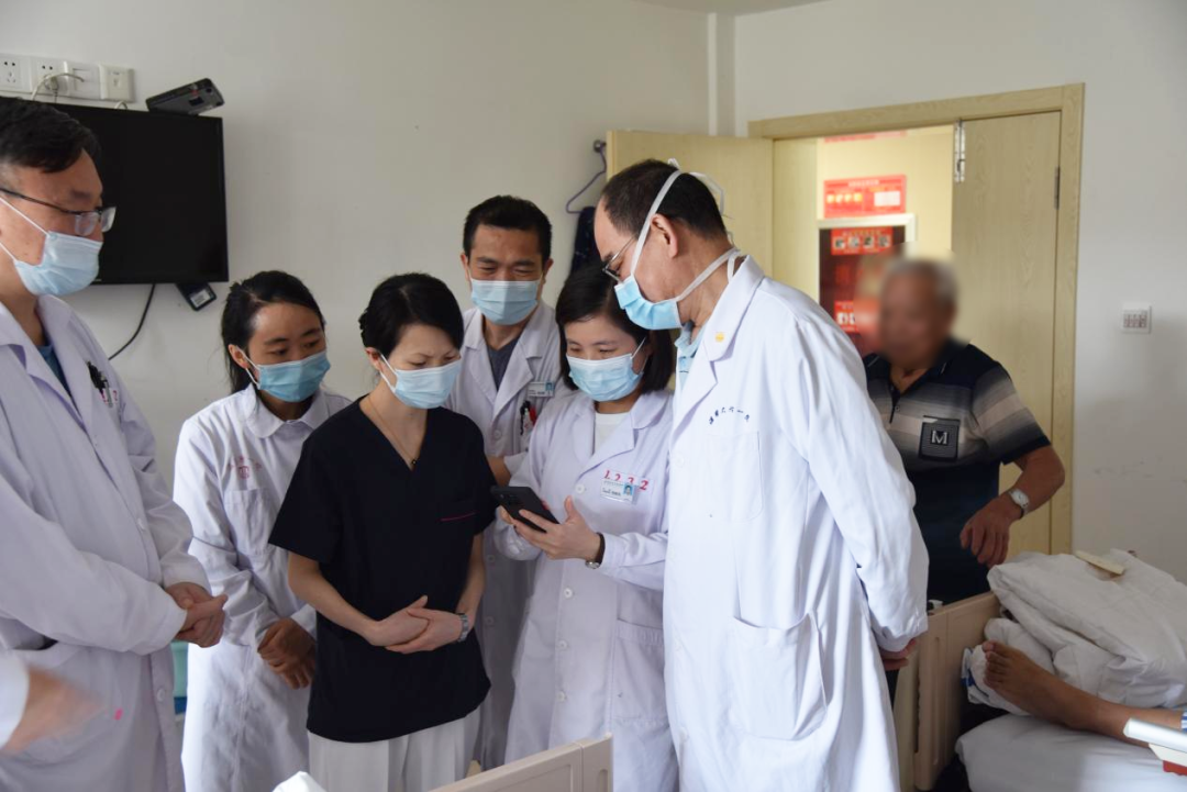 ▲专家团队与我院创面修复科医护进行沟通,并为患者及家属答疑解惑。