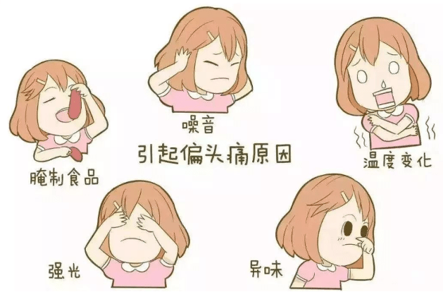 刺激性食物会导致头痛,比如喝酒、吃巧克力、冰淇淋、浓茶、加工肉等可能导致头痛。环境中亮度大、噪音大、温度高或者低,都容易导致头痛,尽量避免在这样的环境中久待。