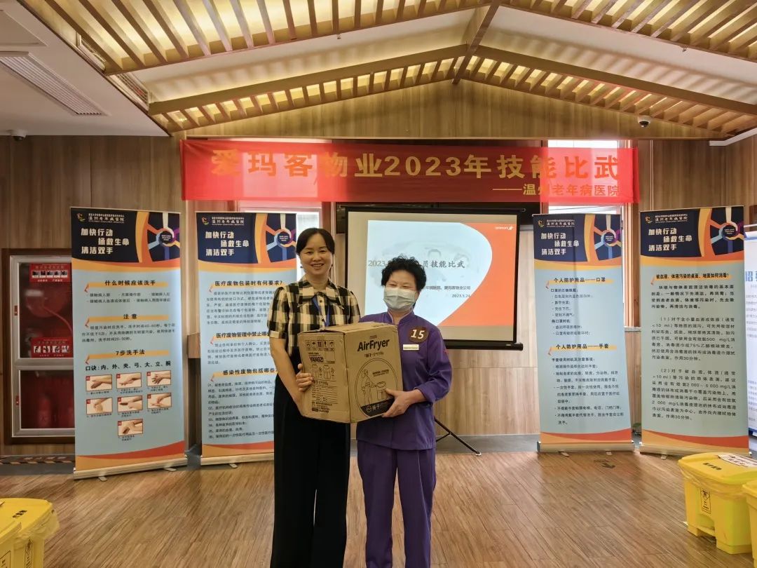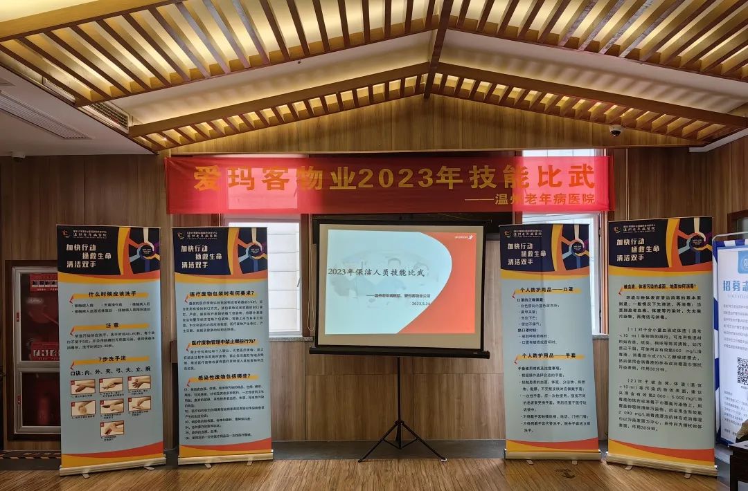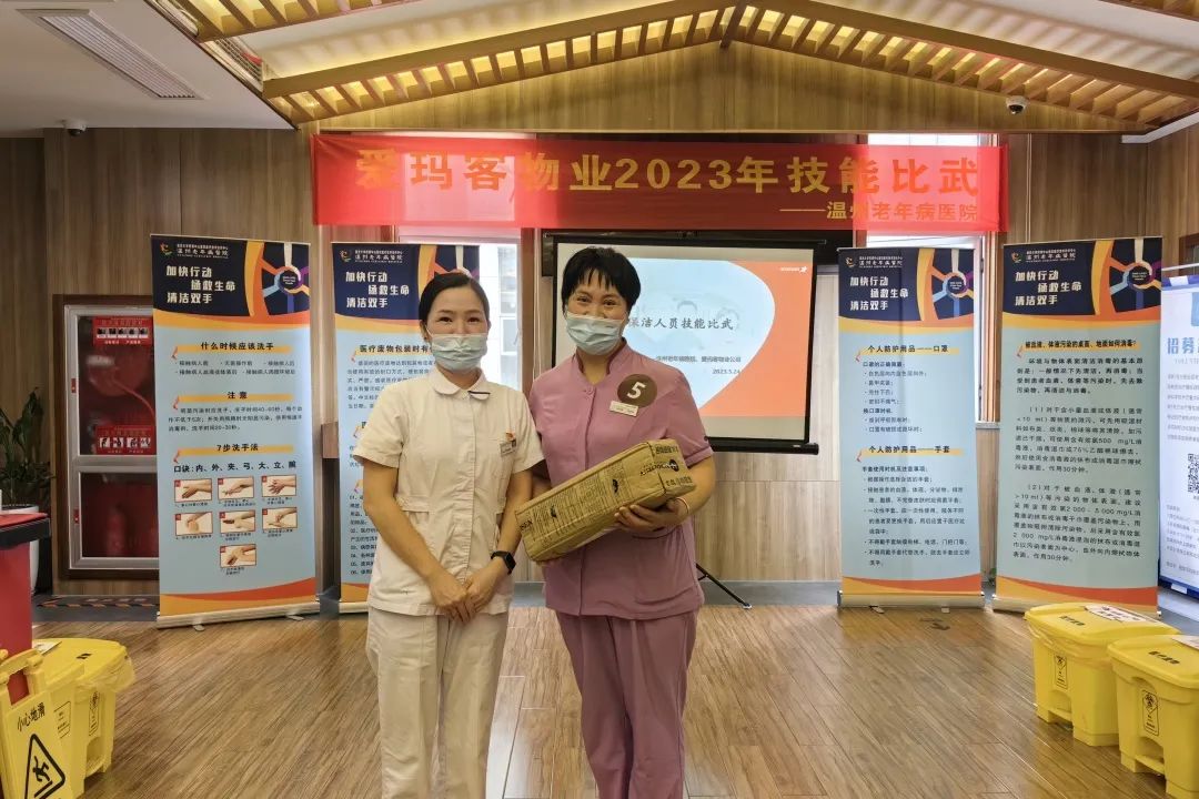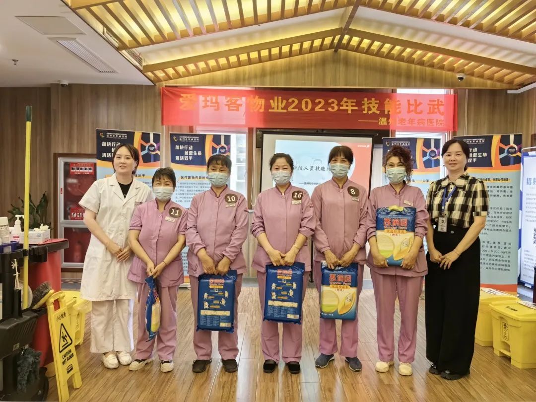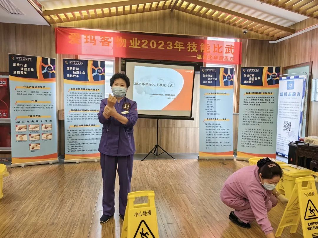2023年5月24日中午,温州老年病医院院感科联合爱玛客物业公司在门诊共同举办了“环境表面大量血液、体液溅污及呕吐物、排泄物污染的清洁消毒”技能比赛。
