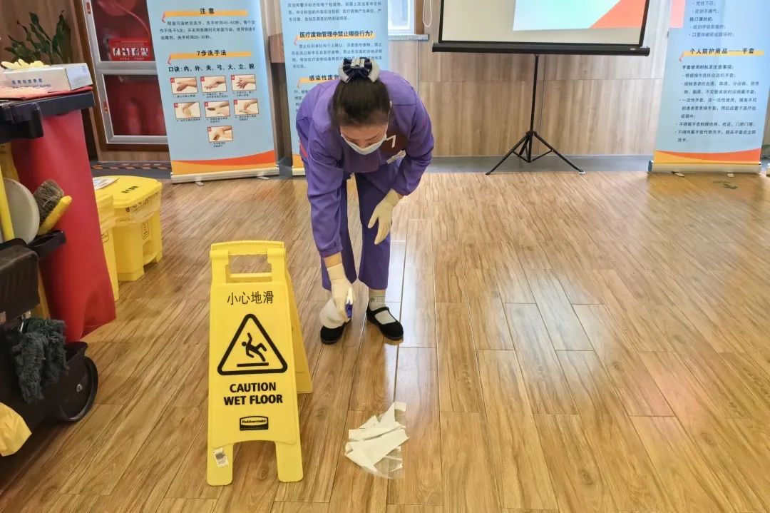 鼓舞人心的讲话过后,参赛的保洁人员们在比赛过程中模拟了发生患者体液、血液污染的情况,并对“突发状况”进行了规范化的清洁与消毒。在赛场上,保洁员们正确穿脱防护用品,正确配比消毒液,正确使用医疗垃圾打包方法,遵从由外到内拖的要求进行清洁消毒,充分展现了参赛选手处理血液、体液的应急能力。