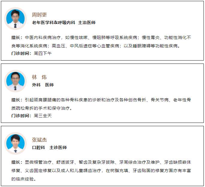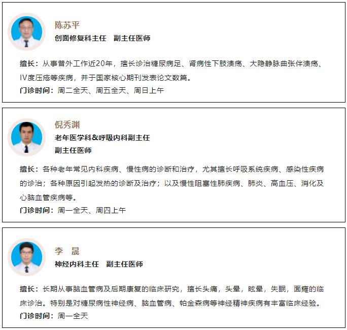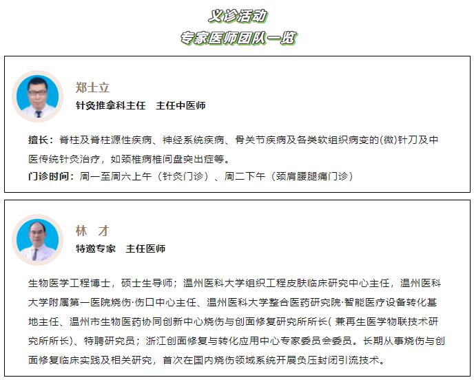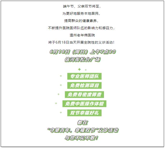 义诊汇聚我院肿瘤科、老年医学综合内科、心血管内科、肾病科、骨科(外科)、创面修复科、针灸推拿科、神经内科、口腔科等科室的专家骨干力量!与此同时,温州老年病医院党支部与温州医科大学附属第一医院皮肤烧伤外科党支部再次联动,并特邀温附一烧伤科、内分泌科专家团队一同莅临现场亲诊!我院护理团队及康复治疗团队也将共同参与本次义诊!