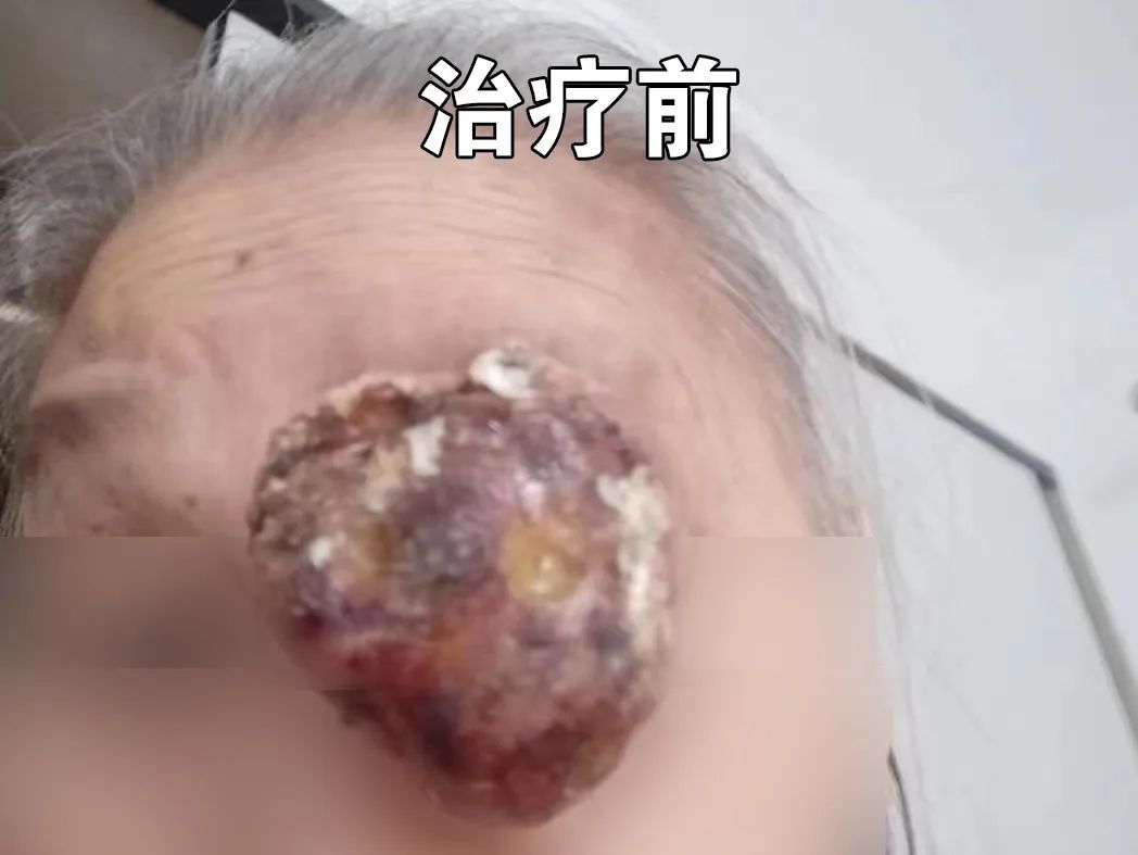 没想到随着时间推移,原本小小的疙瘩越长越大,甚至出现了表面破溃,辗转之下,吴阿婆最终来到我院肿瘤科治疗。来到肿瘤科时,吴阿婆左侧眉骨上的“小疙瘩”已经长成一颗巨型肿瘤,并已导致她的左眼失明。经过缜密的查体、活检及相关检查,我院肿瘤科章国晶主任及其团队判断:这不受控制的肿瘤,极有可能是一颗由毛母质瘤演变而来的“毛母质癌”。