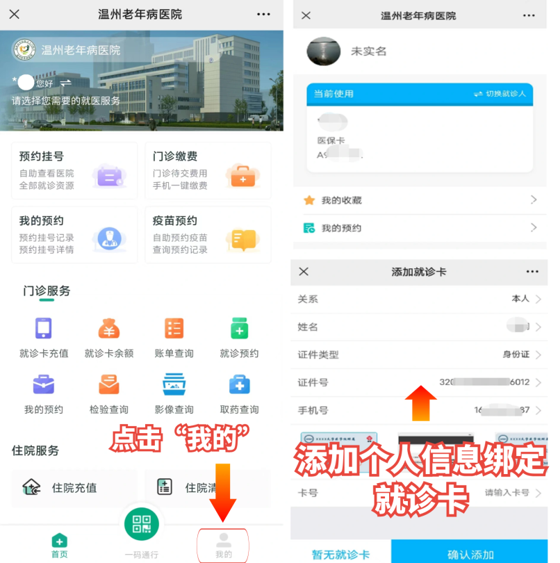 点击首页“我的”,添加就诊人,输入姓名、身份证、手机号、卡号进行绑定。