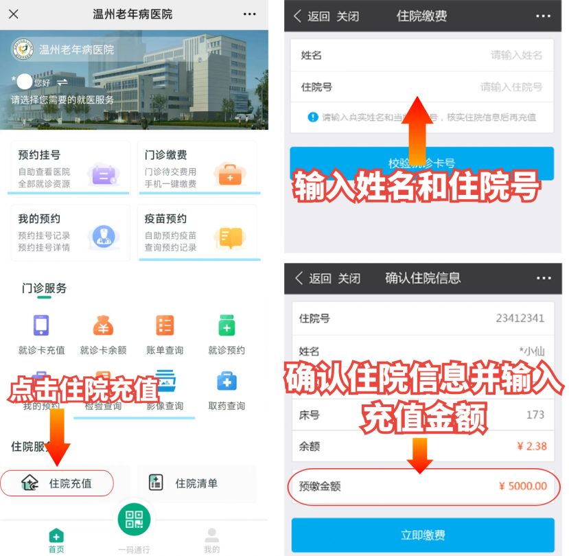 点击首页“住院充值”,输入姓名和住院号,确认住院信息并输入充值金额
