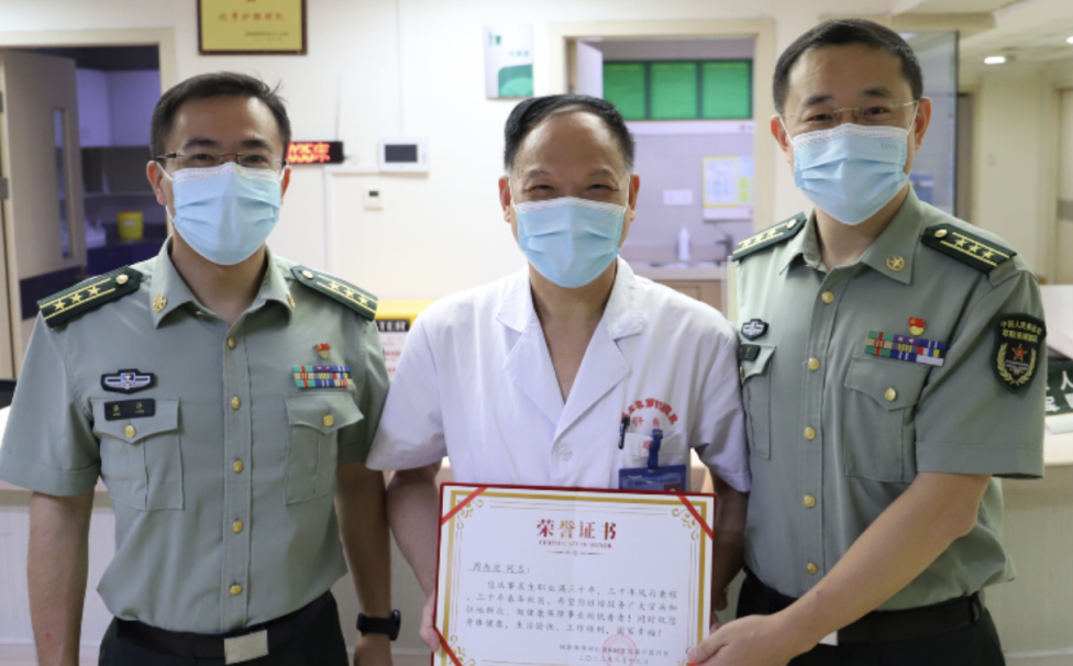 在门诊,他积极收治危重患者,为患者排忧解难;在病房,住院的慢加急肝衰患者在他和医师团队的精心治疗下,病情明显好转……8月19日医师节,奋战在临床一线的周岳进接受温州老年病医院领导班子慰问,捧着感谢花束他感慨地说:“去年的医师节,我部队的首长给我颁发了从医五十年的证书和奖牌,今年又收到了领导的温馨关怀,如果说军队五十多年是我军旅医学生涯的第一步,那么温州老年病医院就是我医学生涯的最后驿站。我要像热爱军队一样热爱临床工作,为患者服务!”