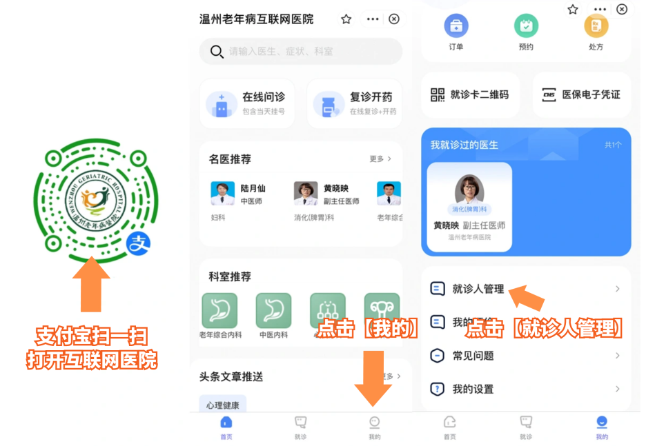 ▲支付宝扫一扫打开互联网医院。点击首页【我的】-【就诊人管理】-【添加就诊人】,填写就诊信息并提交,即可在互联网医院完成个人及家人就诊信息绑定。