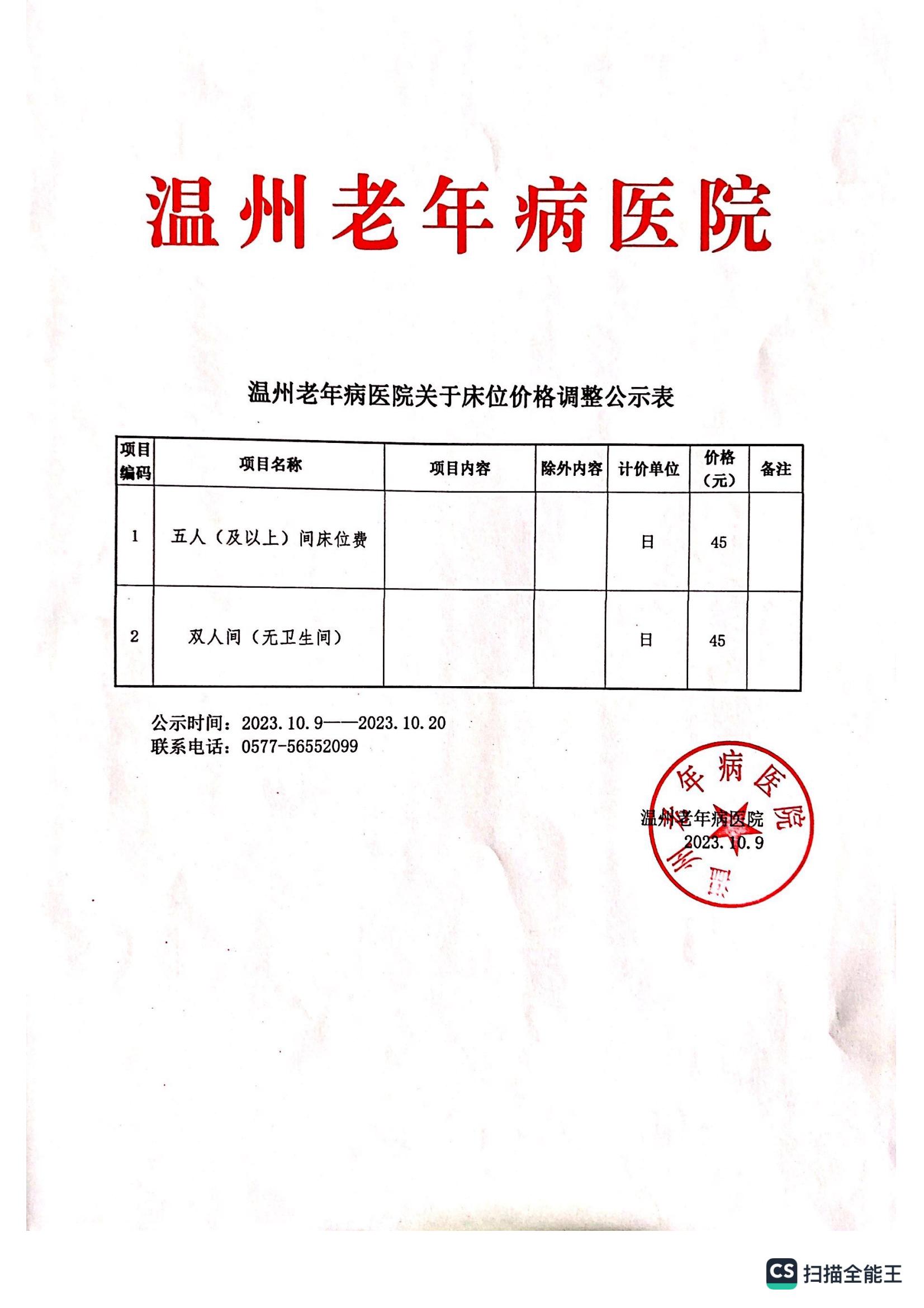 温州老年病医院关于床位价格调整公示