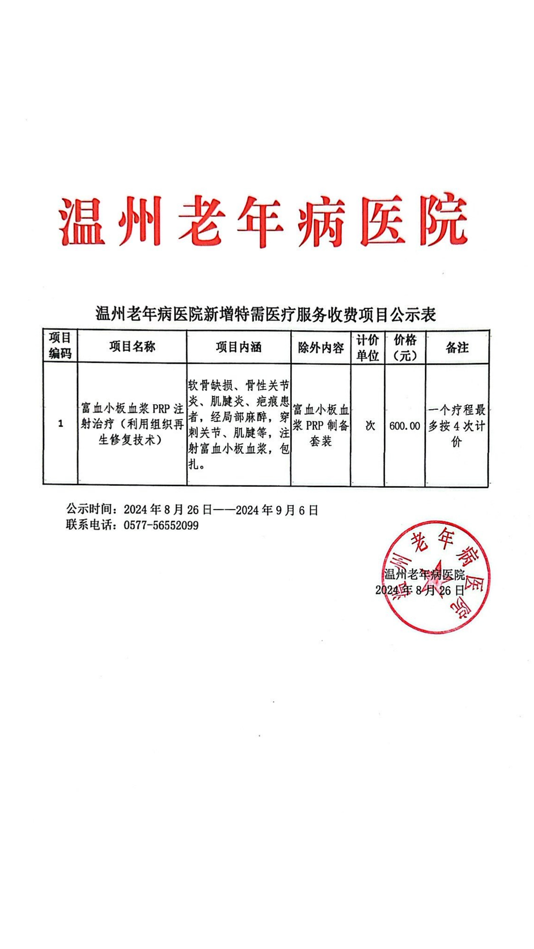 温州老年病医院新增特需医疗服务收费项目公示表