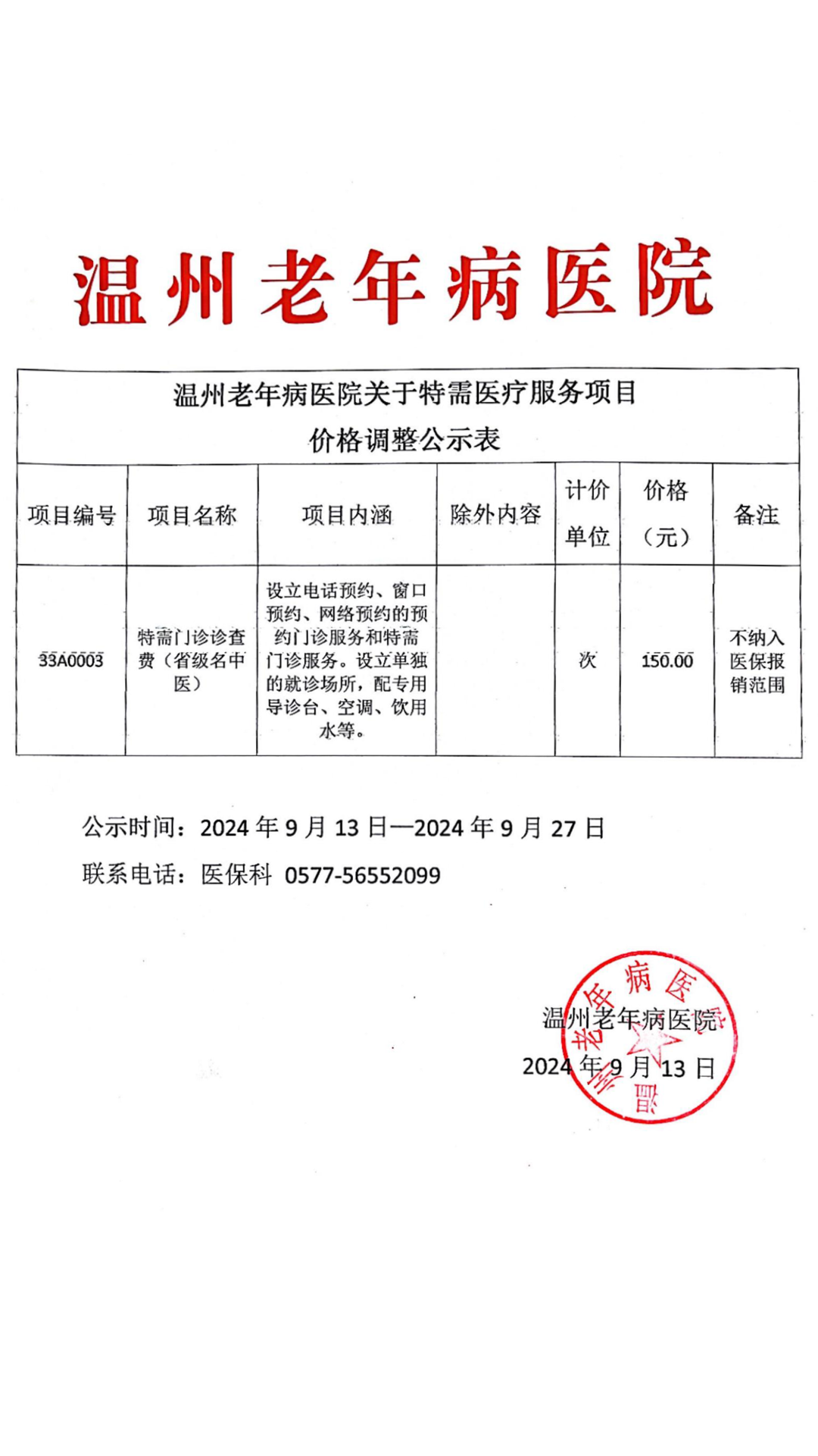 温州老年病医院关于特需医疗服务项目价格调整公示