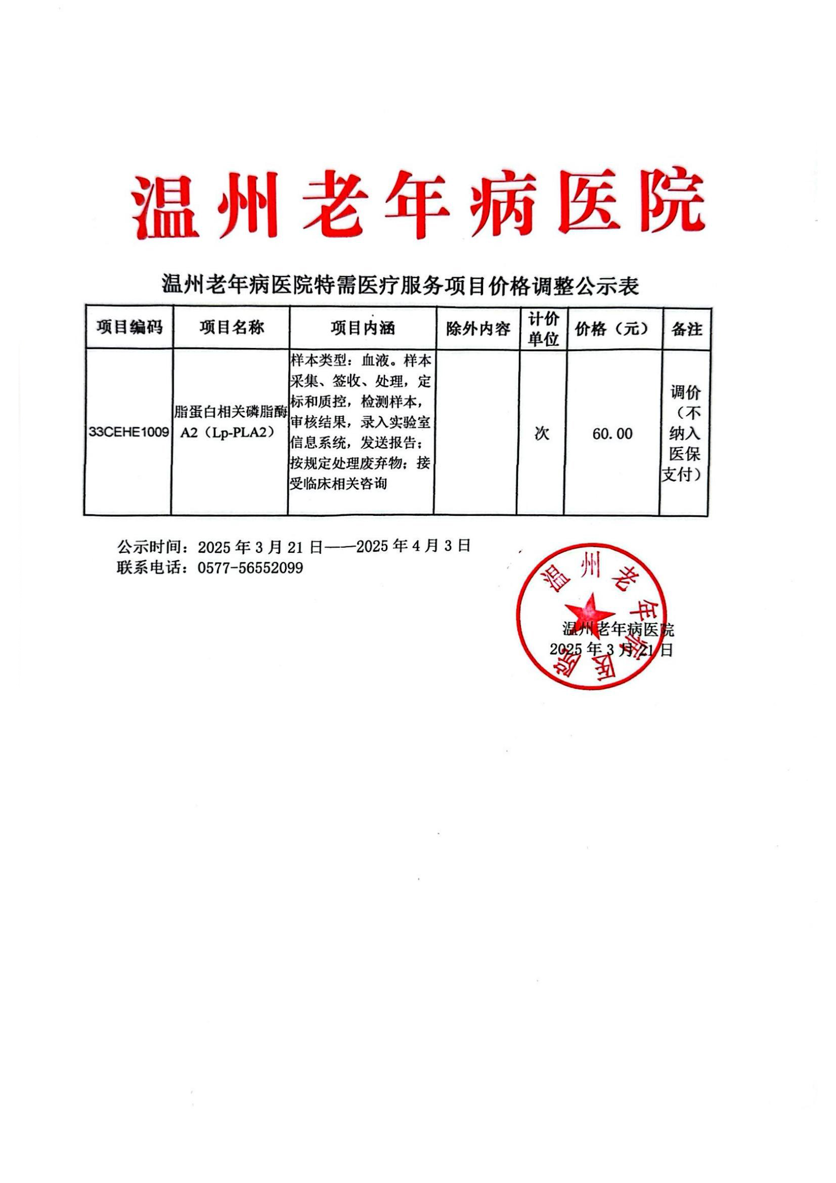 温州老年病医院新增特需医疗服务收费项目公示
