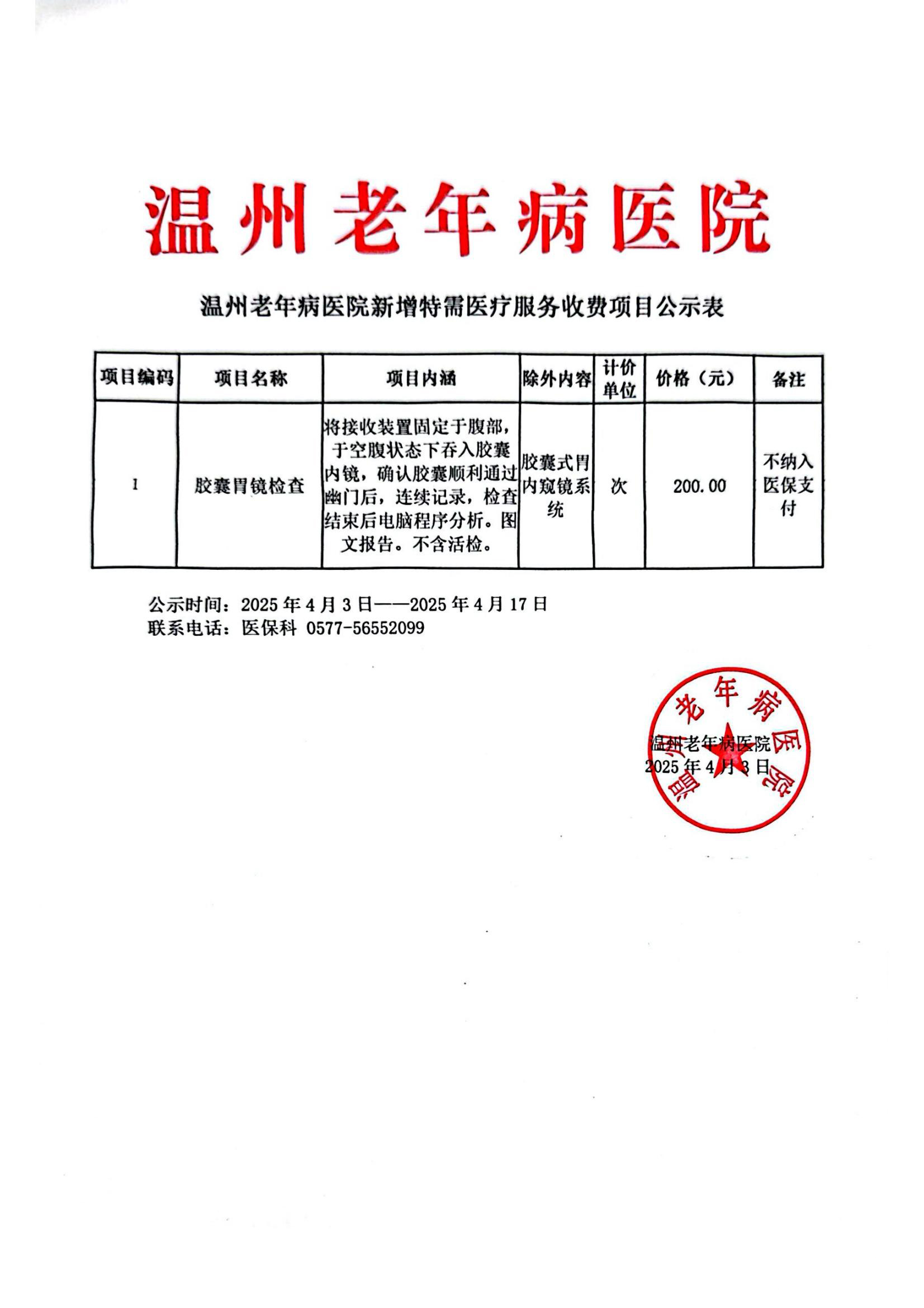 温州老年病医院新增特需医疗服务收费项目公示
