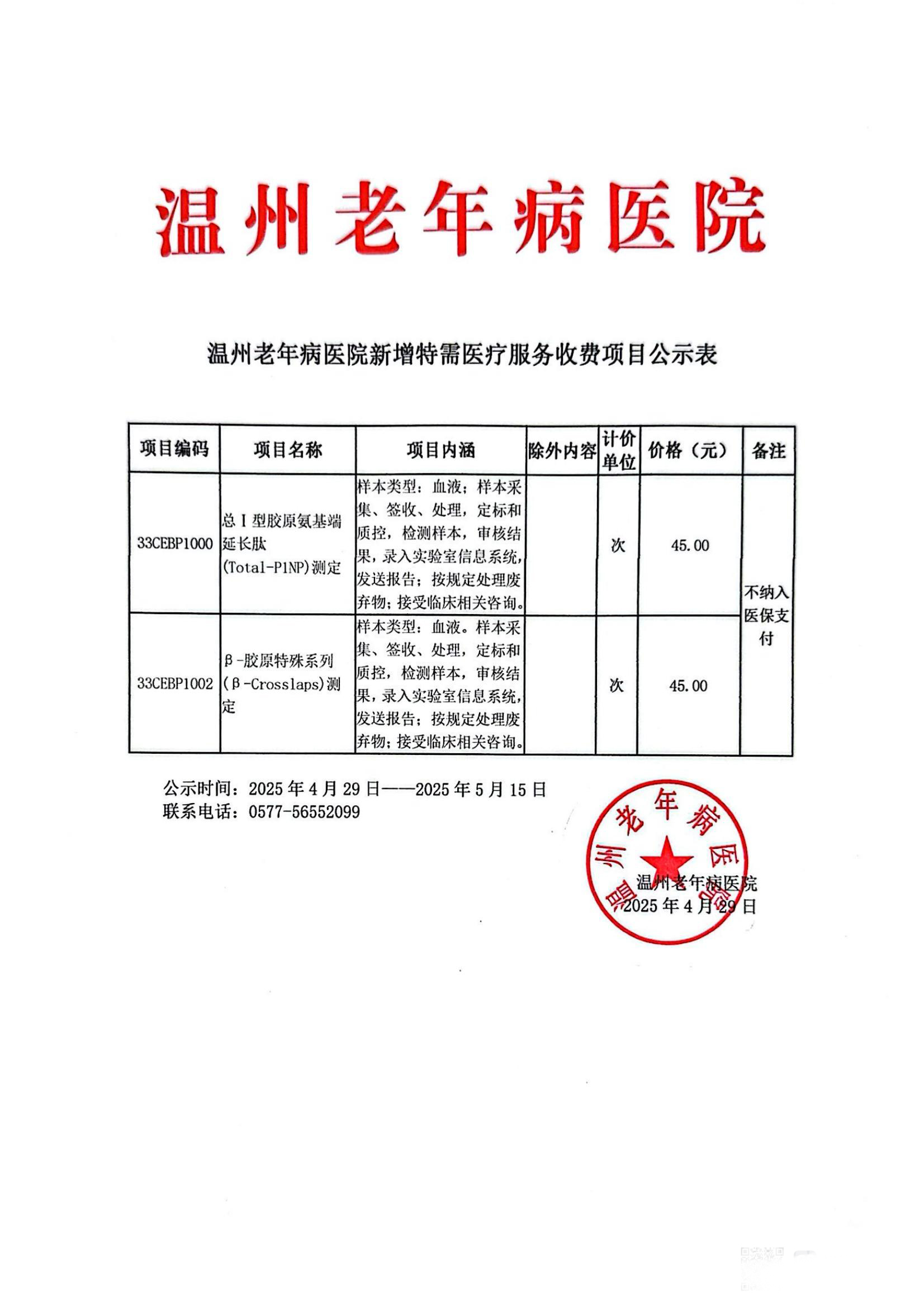 温州老年病医院新增特需医疗服务收费项目公示