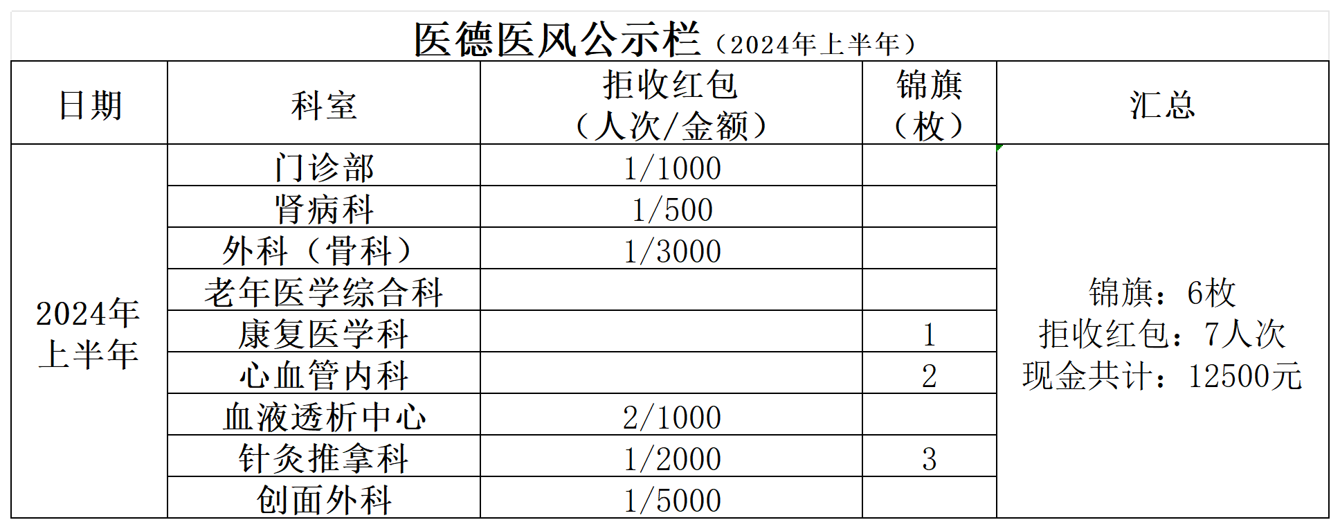 根据医院推进“无红包医院”的工作要求,现对医院2024年上半年度医德医风情况进行通报表扬。具体情况如下: