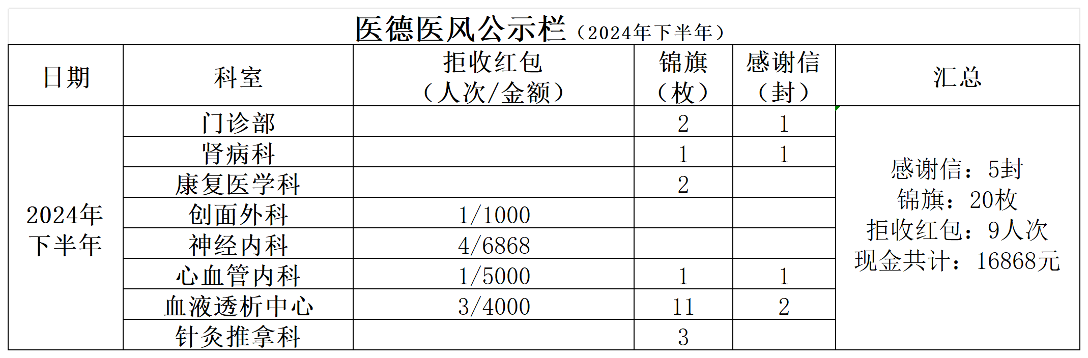 根据医院推进“无红包医院”的工作要求,现对医院2024年下半年度医德医风情况进行通报表扬。具体情况如下:
