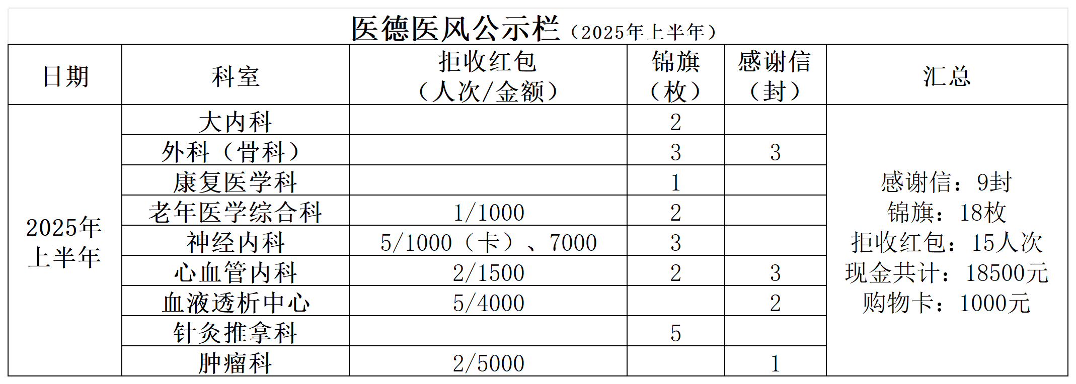 医德医风公示栏(2025年上半年)